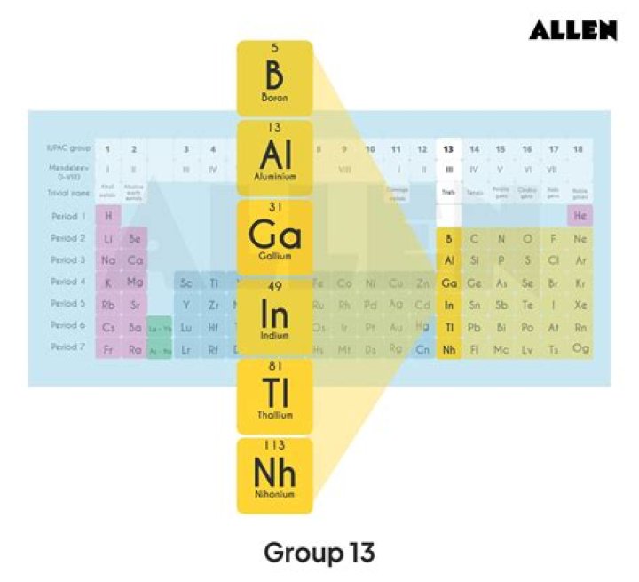 The boron group is sometimes called group 13 of the periodic table since the first member at the top of the group is boron (B). Even in this community, Boron is the only metalloid. All the metals are the other four elements in the group: aluminium (Al), gallium (Ga), indium (In), and thallium (Tl).