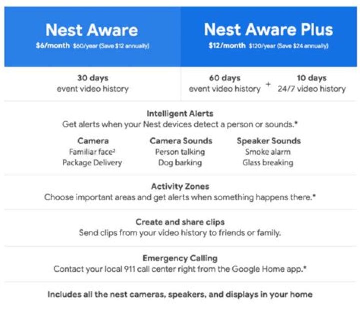 Subscriptions start at just $6/month (or $60/year, with a $12 annual savings) across all the Nest cameras, doorbells, speakers, and displays in one home. Nest Aware Plus unlocks more days of event video history and 10 days of 24/7 video history for just $12/month (or $120/year, with a $24 annual savings).