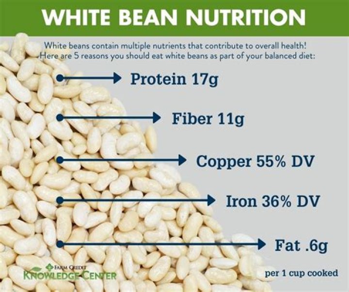 White Beans (1 cup) contains 43.6g total carbs, 32.6g net carbs, 0.6g fat, 16.9g protein, and 242 calories.