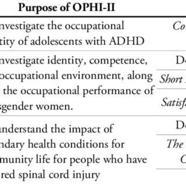 SUMMARY The Occupational Performance History Interview-Second Version (OPHI-II) is a semi-structured interview that gathers life history information. The interview data is used to score three rating scales and complete a narrative slope. Previous research has primarily examined the validity of the scales.