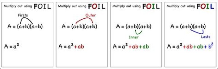 “A technique for distributing two binomials. The letters FOIL stand for First, Outer, Inner, Last. First means multiply the terms which occur first in each binomial. Then Outer means multiply the outermost terms in the product.”