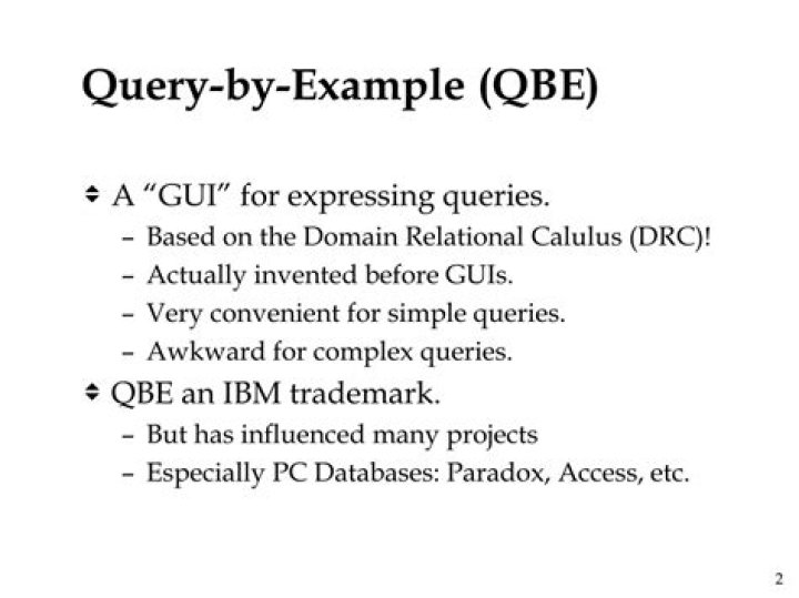 Query-by-Example (QBE) is another language for querying (and, like SQL, for creating and modifying) relational data. It is different from SQL, and from most other database query languages, in having a graphical user interface that allows users to write queries by creating example tables on the screen.