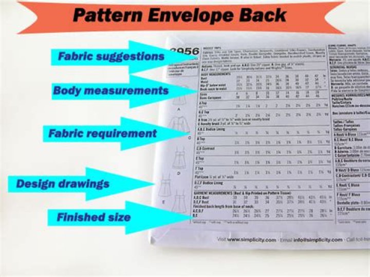 The Back of the Patten Envelope: On the back of the pattern envelope is a chart that states the amount of fabric you need to make the garments. Usually, the chart lists the fabric width so you can easily find the length you need. The most common width is 36 inches, 45 inches and 60 inches.