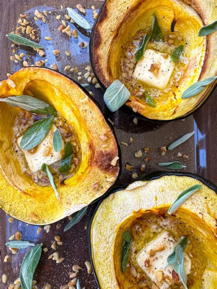 Crumble 1 tablespoon brown sugar into the center of each half and drizzle with 1 teaspoon maple syrup. Bake: Bake at 400°F for about 1 hour to 1 hour and 15 minutes, until the tops of the squash halves are nicely browned and the squash flesh is very soft and cooked through.