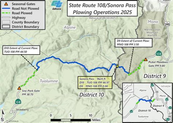 STOCKTON – The California Department of Transportation (Caltrans) reopened State Route 108/Sonora Pass at approximately 10:00 a.m. on Thursday, October 14, 2021, and now all four Sierra Nevada passes are open after being temporarily closed this week due to inclement weather.