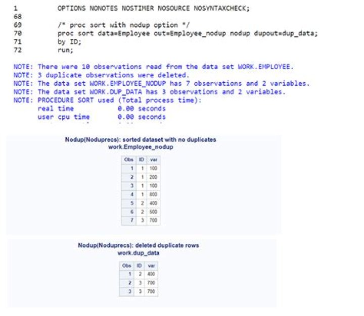 The DUPOUT= option is used with either the NODUPKEYS or NODUPRECS option to name a data set that will contain duplicate keys or duplicate observations. The DUPOUT= option is generally used when the data set is too large for visual inspection. In the next code example, the DUPOUT= and NODUPKEY options are specified.
