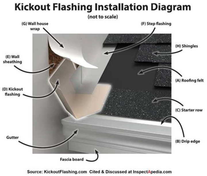 Kick-out flashing should be installed at the end of a roof-wall intersection to divert water away from the wall and into gutters. The kick-out flashing should be large enough to handle expected stormwater flows.