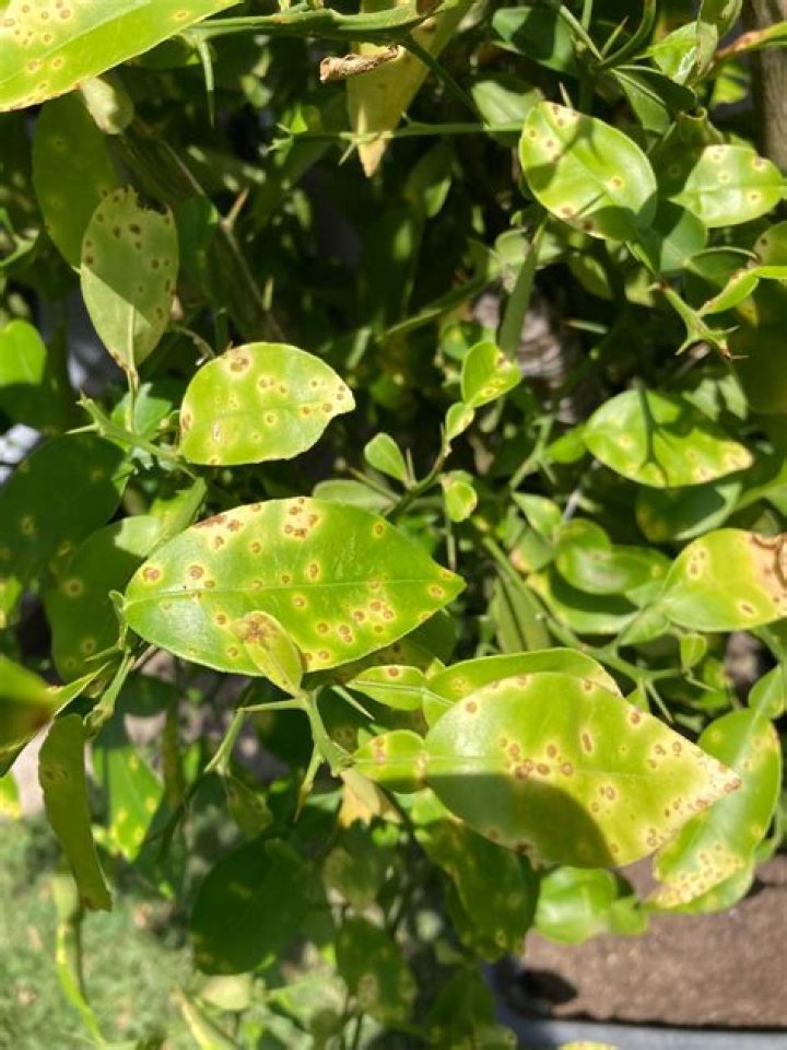 Citrus canker symptoms include brown spots on leaves, often with an oily or water-soaked appearance. The spots (technically called lesions) are usually surrounded by a yellow halo, and they can be seen on both the upper and lower sides of the leaf. Similar symptoms can appear on fruit and stems.