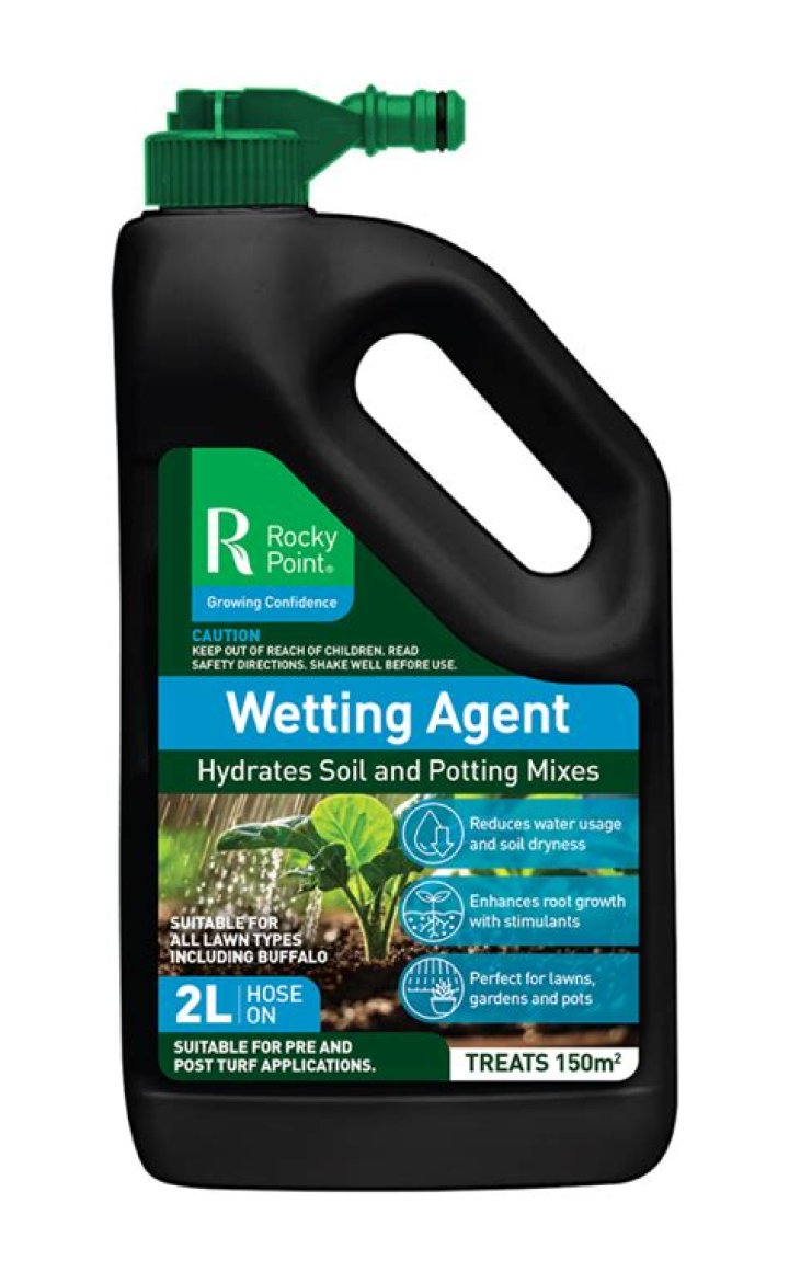 Wetting agents, which include surfactants, reduce the surface tension of water so that it spreads and is absorbed by dry soil and potting mix. They help water transfer from particle to particle. They are widely used to enhance the effects of pesticides.
