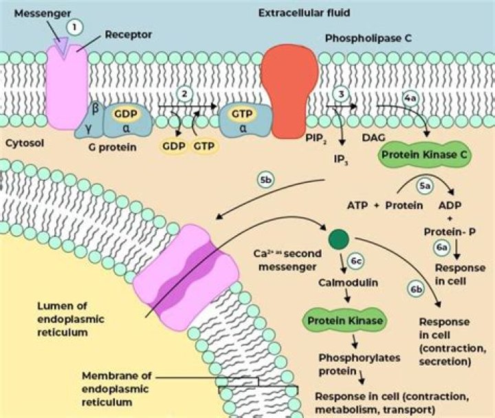 Once the G protein has been stimulated it activates phospholipase C which cleaves a phospholipid called phosphatidylinositol 4,5- biphosphate found in the plasma membrane lipid bilayer. This results in two products: inositol 1,4,5 triphosphate (IP3) and diacylglycerol (DAG).