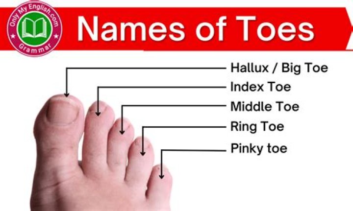 The Big Toe is “The Hallux” aka “The Big Toe”. The second toe is “The pointer Toe”, The third toe is “The Middle Toe” or “The Long Toe”, The fourth Toe is “The Ring Toe”, and the last toe is “The outermost toe” or “The Pinky toe”.