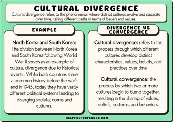 Cultural divergence occurs when different cultural influences cause an area to divide into separate parts. Cultural convergence occurs when different cul- tures exchange ideas and become more similar. This can be seen in the spread of democratic ideas, the English language, technology, and global sports.