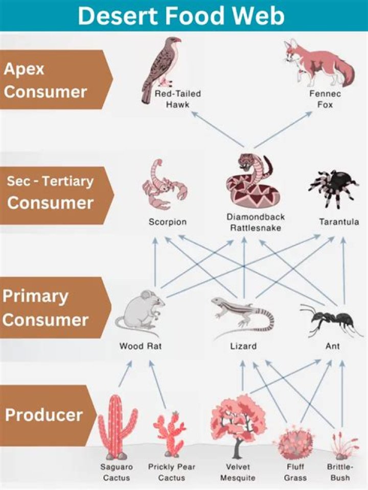 Primary consumers in the desert include camels and gazelles. Secondary consumers like the jerboa, snakes and scorpions feast on primary consumers. Tertiary consumers, including some birds, eat primary and secondary consumers.