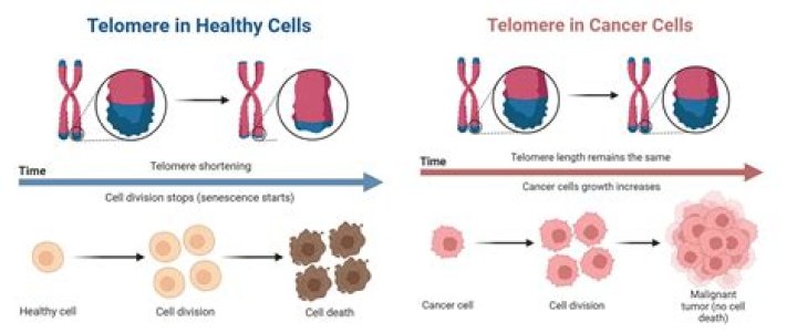 Every time a cell divides, the telomere gets a bit shorter. Telomeres will becomes so short that additional cell division can cause the loss of functional, essential DNA