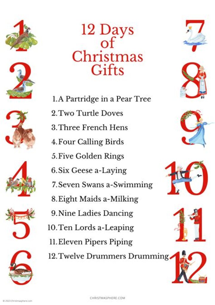 01 of 12. A Partridge in a Pear Tree. The Spruce. 02 of 12. Two Turtledoves. The Spruce. 03 of 12. Three French Hens. The Spruce. 04 of 12. Four Calling Birds. 05 of 12. Five Golden Rings. 06 of 12. Six Geese a Laying. 07 of 12. Seven Swans a Swimming. 08 of 12. Eight Maids a Milking.