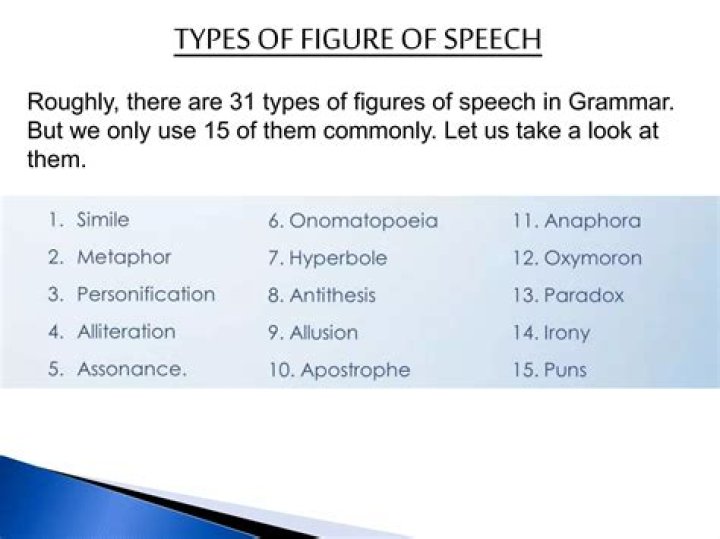 Some common figures of speech are alliteration, anaphora, antimetabole, antithesis, apostrophe, assonance, hyperbole, irony, metonymy, onomatopoeia, paradox, personification, pun, simile, synecdoche, and understatement.