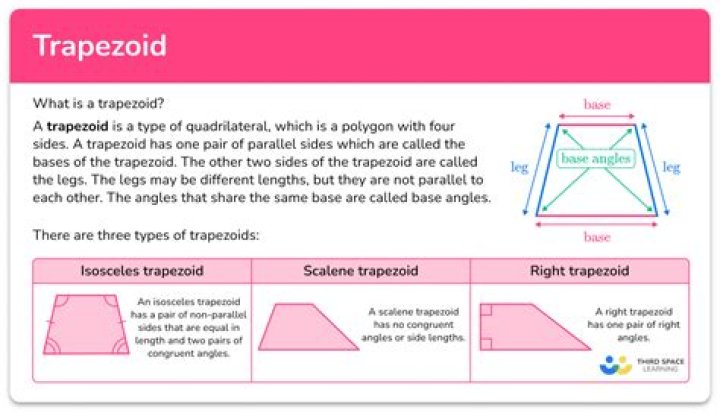 A trapezoid (also known as a trapezium) is a flat 2D shape, with four straight sides. It has one pair of parallel sides which are usually the top and bottom sides. The parallel sides are called the bases, while the non-parallel sides are called the legs.