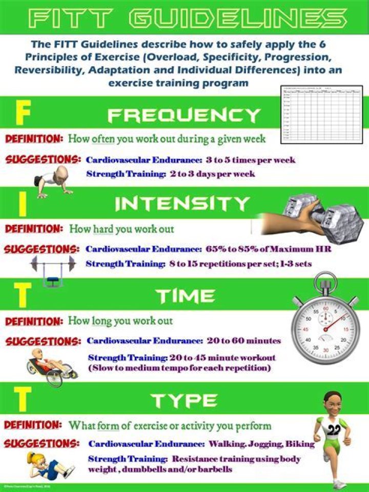 Frequency: How often you exercise.Intensity: How hard you exercise.Time: How long you exercise.Type: The type of exercise you’re doing (e.g., running, walking, etc.)