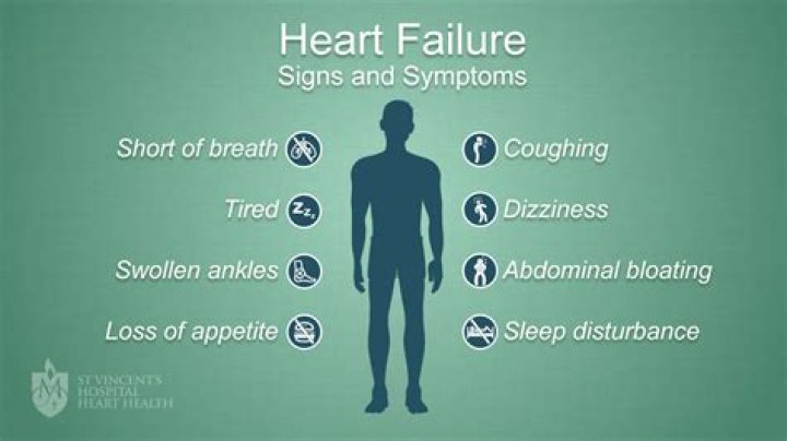 Heart failure signs and symptoms may include: Shortness of breath with activity or when lying down. Fatigue and weakness. Swelling in the legs, ankles and feet.