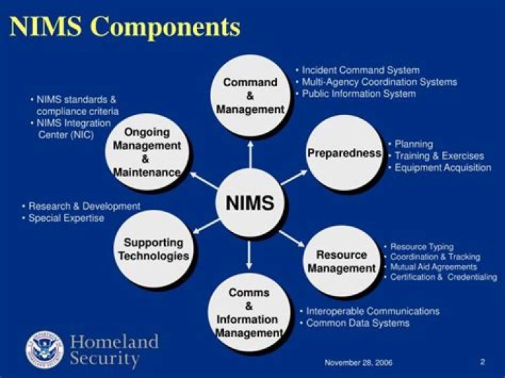 NIMS 2008 defined five NIMS Components: Preparedness, Communications and Information Management, Resource Management, Command and Management, and Ongoing Management and Maintenance.