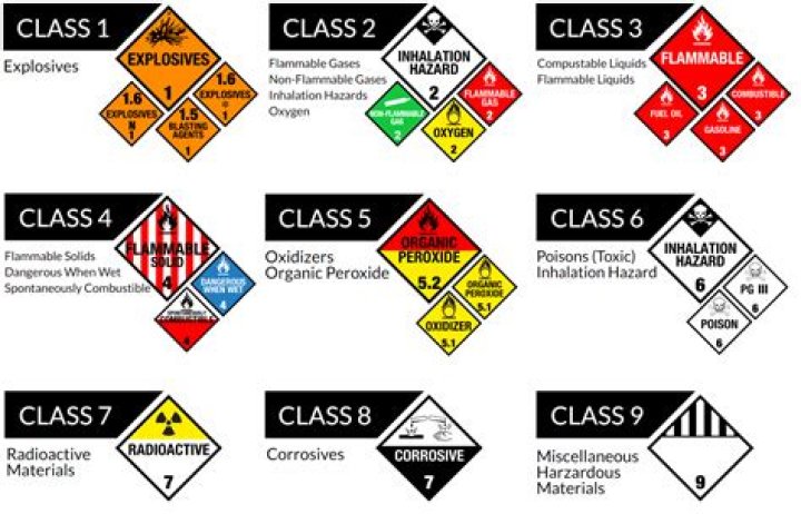 Class 1: Explosives. Class 2: Gases. Class 3: Flammable Liquids. Class 4: Flammable Solids. Class 5: Oxidizing Substances, Organic Peroxides. Class 6: Toxic Substances and Infectious Substances.