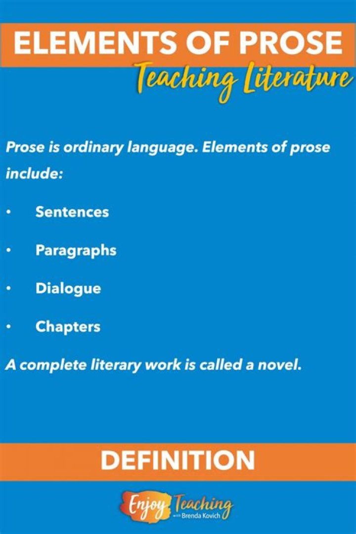 The elements of prose are: character, plot, setting, theme, and style. Of these five elements, character is the who, plot is the what, setting is the where and when, theme is the why, and style is the how of a story.