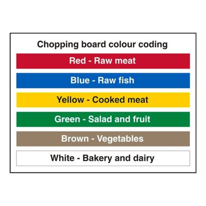 White chopping boards – bakery and dairy products.Yellow chopping boards – cooked meat.Brown chopping boards – root vegetables.Red chopping boards – raw meat.Blue chopping boards – raw fish.Green chopping boards – salad, fruit and fresh vegetables.