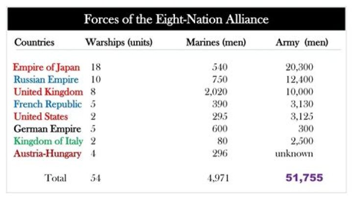 A military coalition of eight nations, Japan, Russia, Britain, France, Germany, Italy, Austria-Hungary, and the United States, arrived in China in August of 1900 and easily defeated the Boxers and Qing forces.