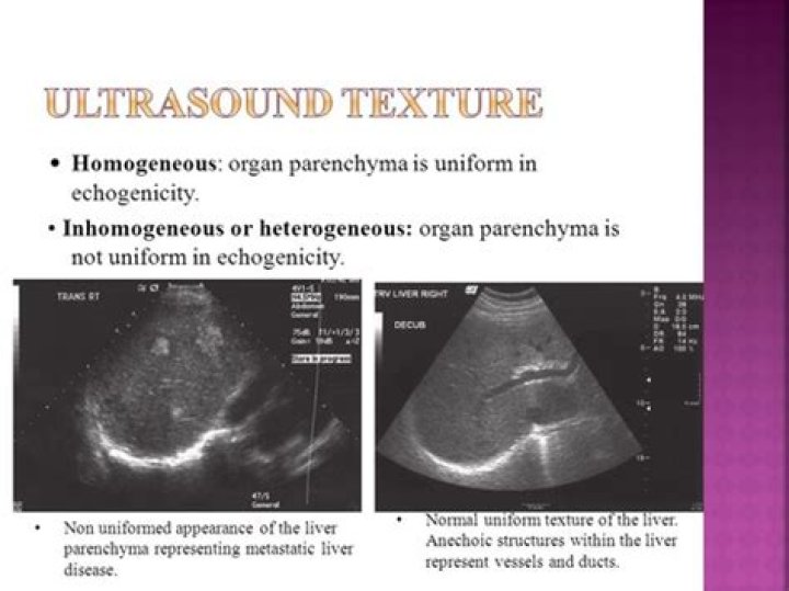 Homogeneous: organ parenchyma is uniform in echogenicity (Figure 1-4). • Inhomogeneous or heterogeneous: organ parenchyma is not uniform in echogenicity (Figure 1-5).