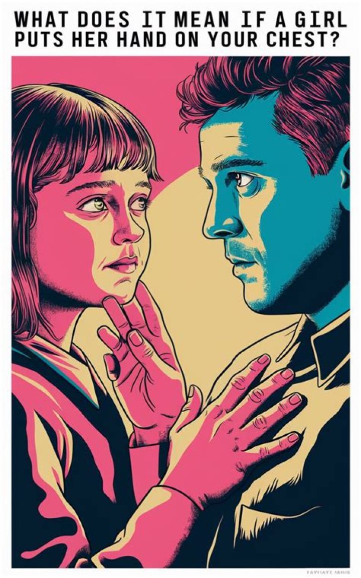 3 possibilities; she is caressing him to encourage a more intimate encounter, she is maintaining separation to discourage a more intimate encounter, or she is checking to see if his heart is still beating.