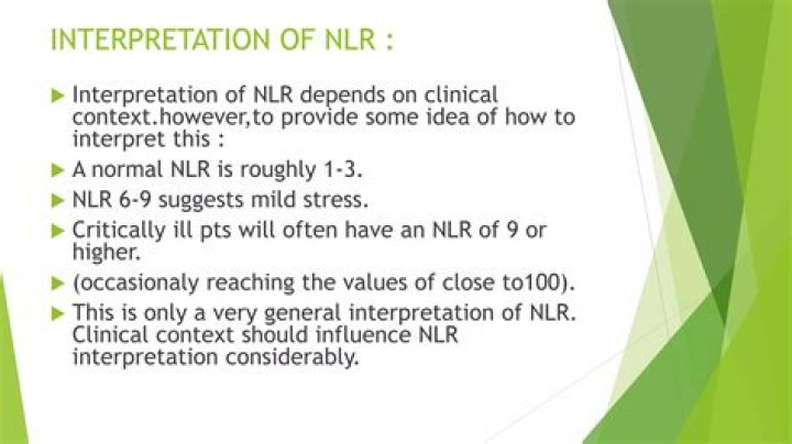 A normal NLR is roughly 1-3. An NLR of 6-9 suggests mild stress (e.g. a patient with uncomplicated appendicitis). Critically ill patients will often have an NLR of 9 or higher (occasionally reaching values close to 100).