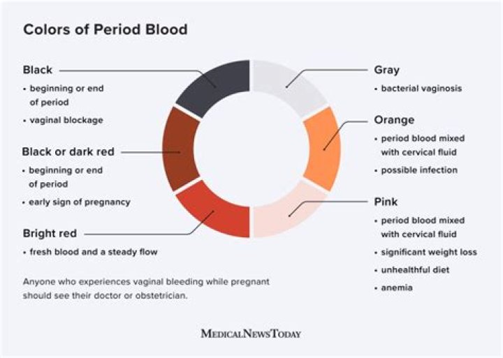 Like black blood, brown or dark red is a sign of old blood, and it may appear at the beginning or end of a period. Brown or dark red blood has not had as long to oxidize as black blood and can appear in a variety of shades.