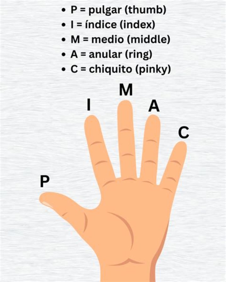 Taken from the classical guitar world, the letters in PIMA stand for the Spanish words for your fingers. It’s mapped like this: P = pulgar (thumb) I = indice (index finger) M = medio (middle finger)