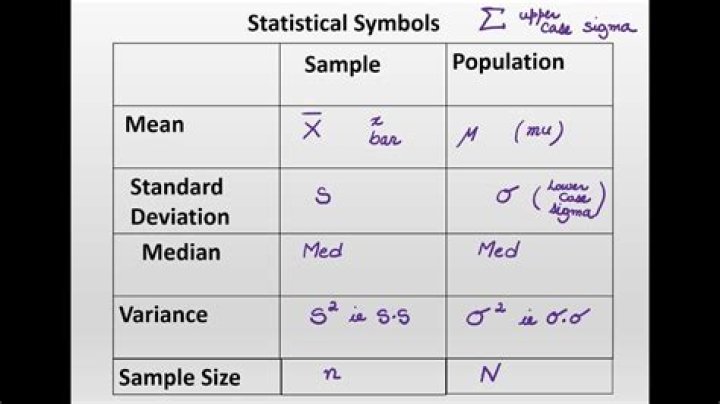 Population mean = μ = ( Σ Xi ) / N.Population standard deviation = σ = sqrt [ Σ ( Xi – μ )2 / N ]Population variance = σ2 = Σ ( Xi – μ )2 / N.Variance of population proportion = σP2 = PQ / n.Standardized score = Z = (X – μ) / σ