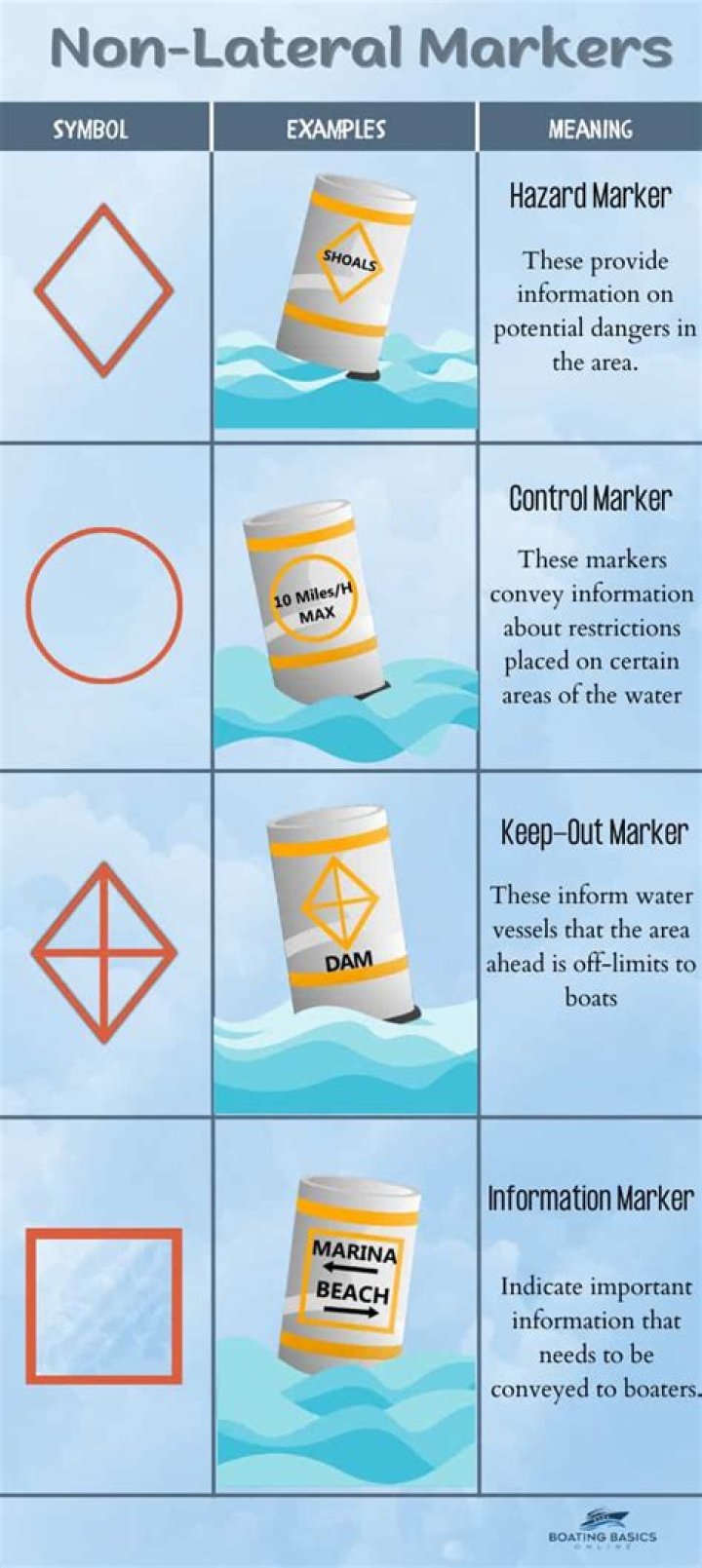 Non-lateral markers are navigation aids that give information other than the edges of safe water areas. The most common are regulatory markers that are white and use orange markings and black lettering. They are found on lakes and rivers.