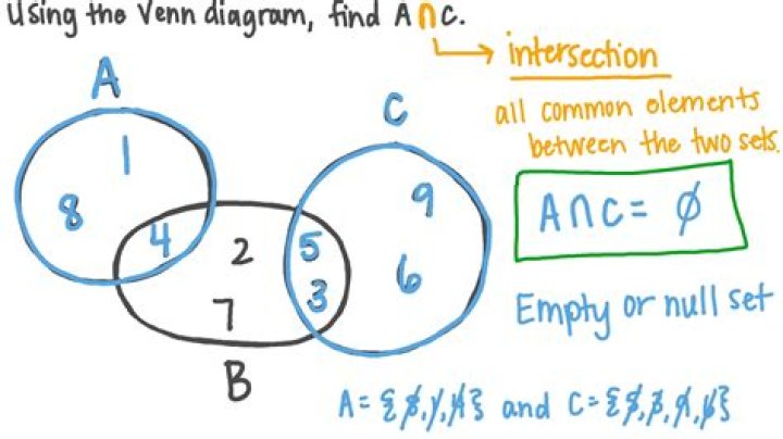 Using the Venn diagram, find the intersection of � and �. This upside-down U is a symbol for intersection. And an intersection is all the common elements between the two sets. … Five is only in the set �, so is three, so is nine, and so is six. This means they don’t have any elements in common.