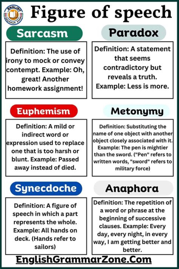 Simile. A figure of speech that says that one thing is like another different thing.Metaphor. A figure of speech that says that one thing is another different thing.Hyperbole. Oxymoron.