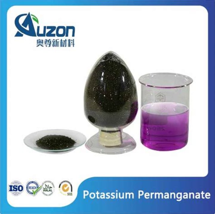Potassium permanganate oxidizes iron, manganese, and hydrogen sulfide into particles. If too much potassium permanganate is fed into the water prior to filtration, the excess potassium permanganate serves as a regenerant for the filter media. The water should be colorless when it leaves the filter.