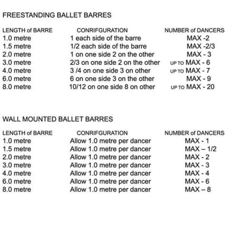 If using for ballet / dance, the typical barre height is as follows: 40″ to 42″ above the floor for a single barre and if installing a double barre system, the lower barre is normally 10″ to 12″ below the top barre. If using for fitness, normally only a single barre is used and the typical barre height is 36″ to 38″.