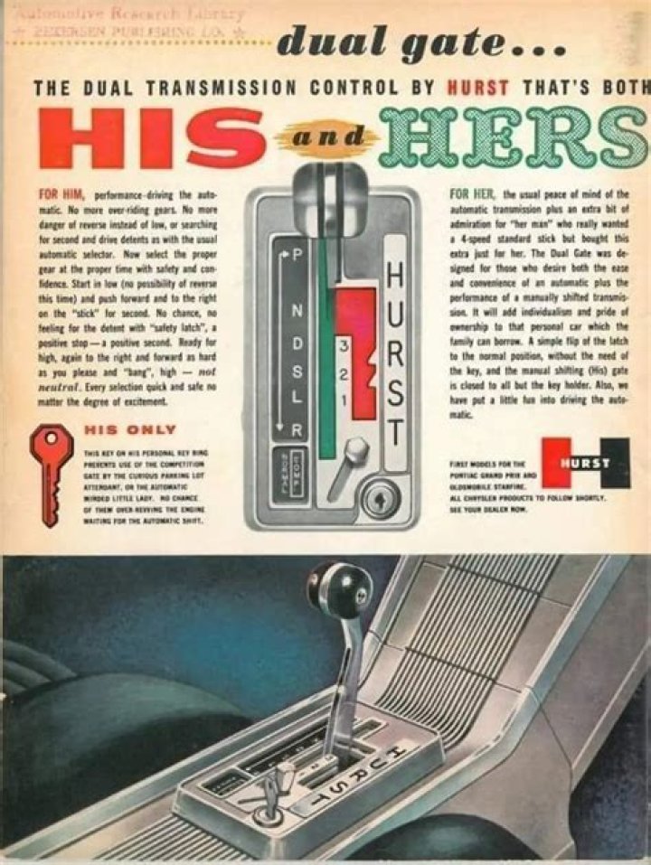 The Hurst Dual Gate or “His ‘n’ Her” shifter was based on a simple idea – a shifter with two paths under the plate. The main shift pattern was the usual PRNDL set up where you placed the lever in Drive and let the transmission do its thing. The trick was for the driver to keep its cool up until the red line.