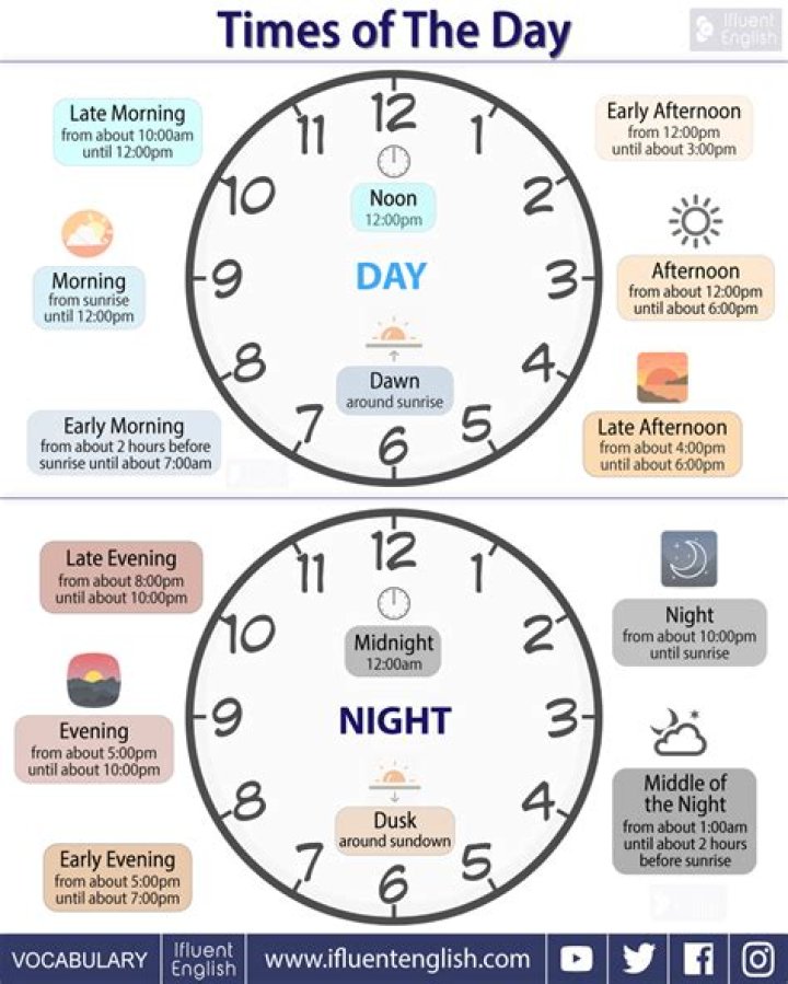 Morning is the time between 5 to 8 a.m., Afternoon is the time between 1 to 5 pm, Evening is the part between 5 to 7 pm, and Night is the time from 9 to 4 pm.