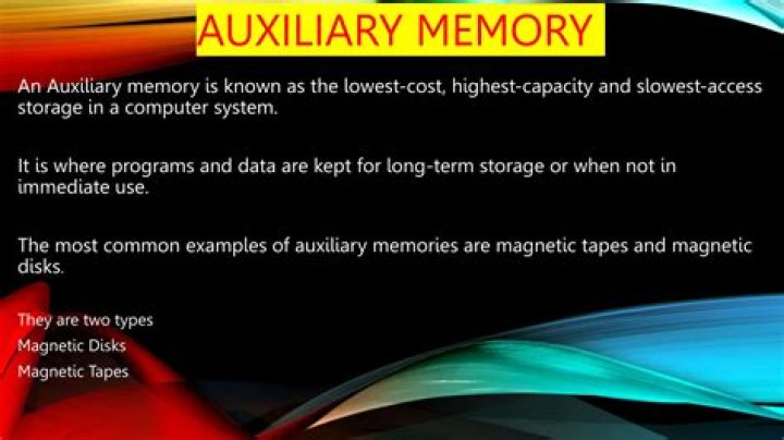 An Auxiliary memory is known as the lowest-cost, highest-capacity and slowest-access storage in a computer system. It is where programs and data are kept for long-term storage or when not in immediate use. The most common examples of auxiliary memories are magnetic tapes and magnetic disks.