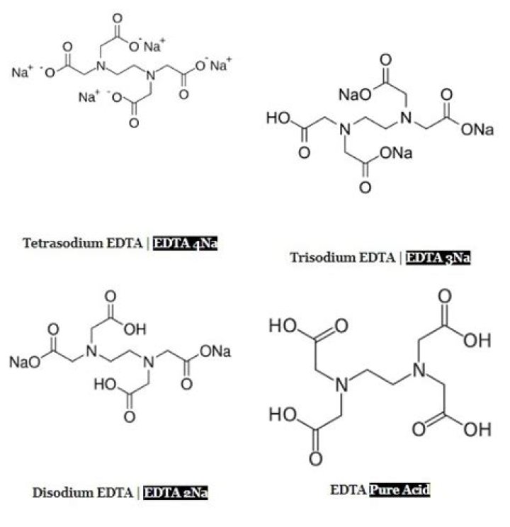 Ethylenediaminetetraacetic acid (EDTA) is a chelating agent can bind to metals via four carboxylate and two amine groups. It is a polyamino carboxylic acid and a colorless, water-soluble solid, which is widely used to dissolve lime scale. EDTA reacts with the calcium ions in dentine and forms soluble calcium chelates.