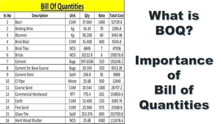 Bills of Quantities (BQ) is one of systematic ways applied in the construction industry in which its primary function is to record items of works for tendering purposes and to create a fair agreement among the parties involved for contracting purposes.