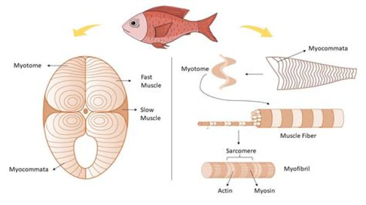 bundles of muscle fibres called myomeres. The myomeres are separated by thin horizontal (myosepta) and vertical (myocommata) layers of connective tissue. The unique structure and thin connective tissue sheaths of fish muscle give the meat its characteristic soft, flaky texture.