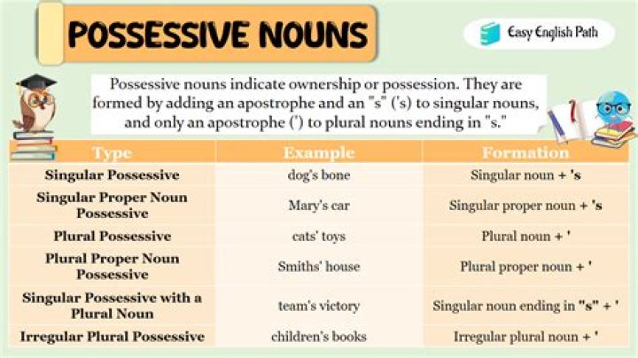 It is clear that the pencil belongs to the boy; the ‘s signifies ownership. The cat’s toy was missing. The cat possesses the toy, and we denote this by use of an apostrophe + s at the end of cat. Plural nouns ending in an s simply take an apostrophe at the end to form a possessive noun.
