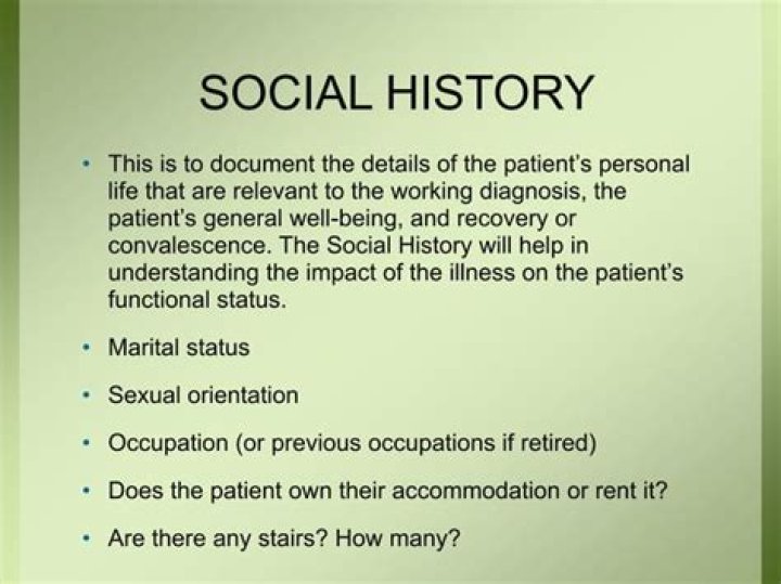 What other health care professionals are currently helping care for you?What are your average daily activities?Any children? Ethnic background?Finances; home situation (location, suitability, help available, transportation)What do you do for a living?Any inherited diseases?
