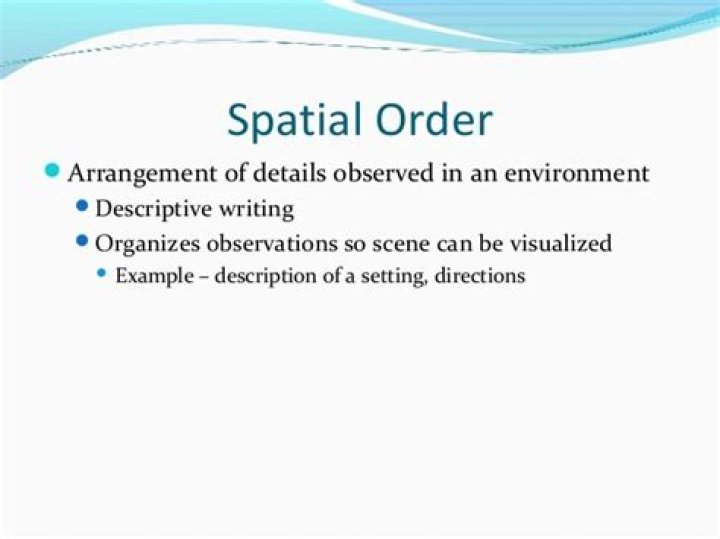 Spatial Order Behind, next to, diagonally, horizontal, in front of It describes where something is in space, or where something is in relation to others.