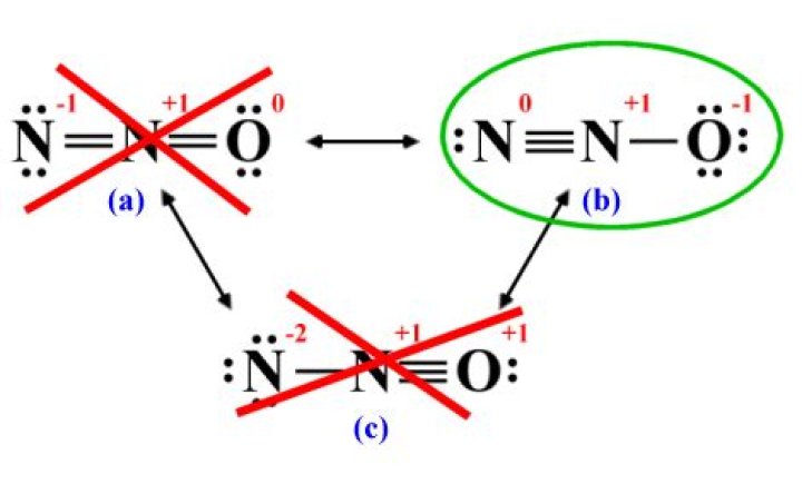 Dinitrogen monooxide, or N2O , has three resonance structures, out of which one is a major contributor and one is a minor contributor. Moreover, it shows a positive charge placed on the more electronegative oxygen atom and a very destabilizing (-2) formal charge on a nitrogen atom.