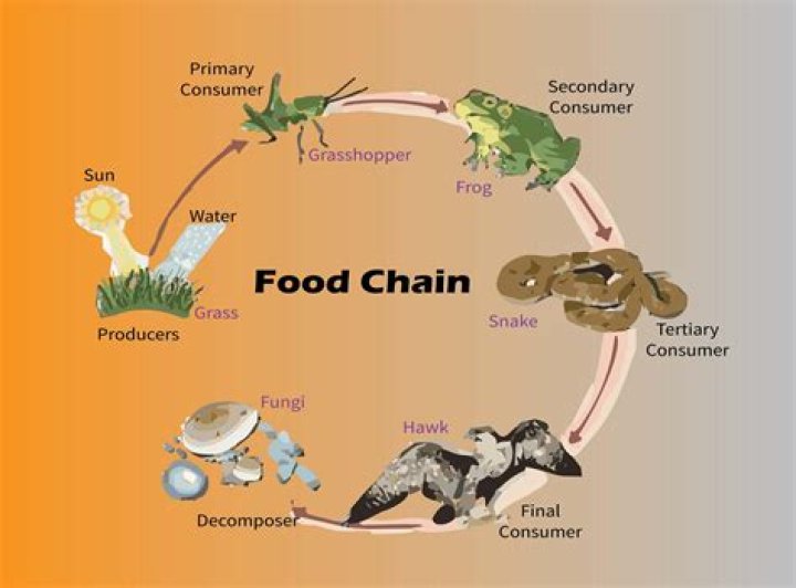 A food chain shows the feeding relationship between different organisms in a particular environment and/or habitat. Food chains show how energy is passed from the sun to producers, from producers to consumers, and from consumers to decomposes such as fungi. They also show how animals depend on other organisms for food.